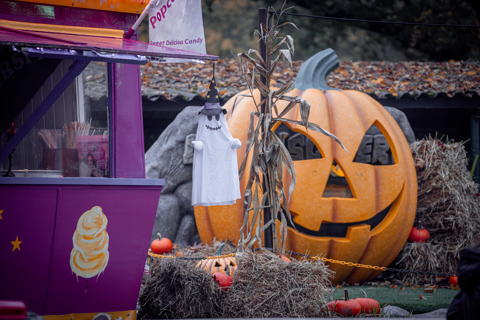 Het gehele park is in Halloweensfeer, overal vind je strobalen, maisstengels, pompoenen en andere Halloweendecoraties.